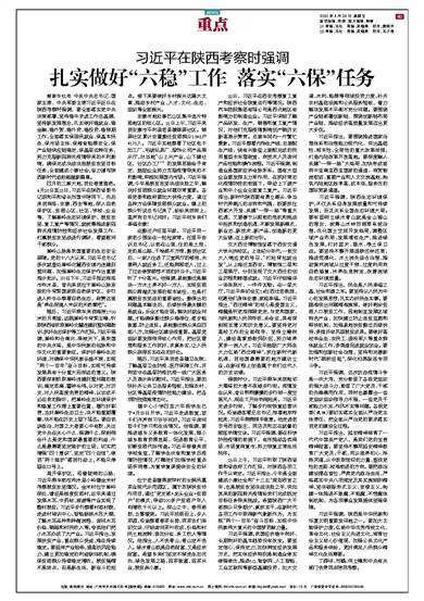 据新华社电 中共中央总书记、国家主席、中央军委主席习近平近日在陕西考察时强调,要全面落实党中央决策部署,坚持稳中求进工作总基调,坚持新发展理念,扎实做好稳就业、稳金融、稳外贸、稳外资、稳