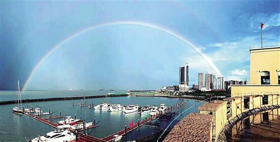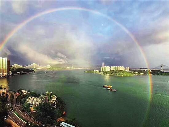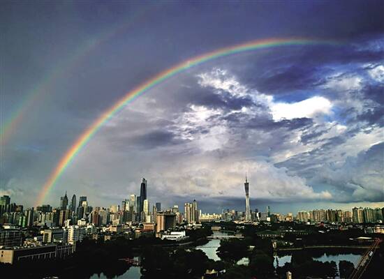新快报讯 6月17日下午6时许,一场大雨过后,广州上空架起两座七彩虹桥。一条色彩鲜艳、亮丽夺目,另一条在云雾间若隐若现。两座彩虹桥跨越天际,与天空大地交相辉映,构成了一幅美丽的风景画。这让人们不自觉地停下了脚步,享受雨后的七色阳光,不少人掏出手机记录下难得一见的美景,在朋友圈掀起一阵彩虹热潮。 ■新快报记者 林里/摄 (部分图片网友提供)
