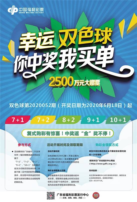 ■新快报记者 陆妍思 通讯员 曹欣然 郭新庆 赠票资金高达2500万元 据了解,与往年相比,今年广东双色球营销活动投入力度继续加码,共安排赠票资金2500万元。活动期间,凡以指定复式投注方式购彩双色球彩票(倍数不限)且中奖的,即符合赠票条件。彩民在兑奖中奖奖金时可获返还与该张彩票投注金额相等的购彩金。单张中奖彩票的购票金或等值的双色球彩票只限该张彩票兑奖时一次性领取。 可能会有彩民朋友有疑问,这里的中奖,是指中了什么奖才有购彩金返还?按照活动规则,只要采取下文提及的5种复式投注方式购彩并中奖了,无论中六等奖还是一等奖,就属于赠票范围,在兑取中奖奖金的同时返还与该张中奖彩票投注金额相等的购彩金。 本次活动从双色球第20052期(开奖日期为2020年6月18日)起至应赠购彩金金额达到2500万元的当期双色球游戏结后停止。符合赠票条件且在兑奖有效期内的中奖彩票,领取购彩金截止时间为活动结束之日起7个自然日内,逾期未领视为自动放弃领取该彩票购彩金。 5种复式投注方式可参与 据悉,为扩大活动覆盖面,更好地贴近购彩者的复式投注习惯,本次双色 球赠票活动将针对5种彩民喜爱的复式投注开展,即:“7个红球+1个蓝球(7+1)、7个红球+2个蓝球(7+2)、8个红球+2个蓝球(8+2)、9个红球+1个蓝球(9+1)、10个红球+1个蓝球(10+1)”。即日起,广州彩民可在全市福彩投注站、好易自助终端及电视购彩渠道采用规则内的5种复式投注双色球游戏。 广东省福彩中心相关负责人表示,经统计,目前广东单式票的机选概率为30%,而复式票的机选概率则只有7%,证明购买复式票的彩民更喜欢自己选号,这次派奖选择复式投注方式也是希望彩民能更深度地参与,享受游戏的乐趣,而入选的5种复式投注方式都是日常较多彩民选择的,兼顾大小面额,尤其是14元的“7+1”,更长期占据最受欢迎的复式投注方式首位。 复式投注方式赠票金额 7个红球+1个蓝球(7+1)“7+1”返14元×倍数 7个红球+2个蓝球(7+2) “7+2”返28元×倍数 8个红球+2个蓝球(8+2) “8+2”返112元×倍数 9个红球+1个蓝球(9+1) “9+1”返168元×倍数 10个红球+1个蓝球(10+1)“10+1”返420元×倍数 电视购彩用户也可参与啦! 电视购彩入口为:1.广东移动IPTV:精品-公益彩票-买彩票;2.广东广电网络:金融广场/应用-电视购彩;3.珠江数码:甜果电视-应用/专区-电视购彩;4.广东番禺有线:禺乐+-应用-公益彩票。