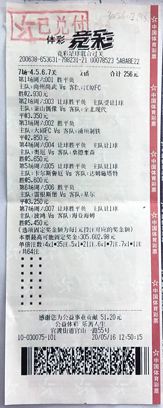 毛先生购买是一张256元的7场自由过关投注票,出自位于市官渡街道官山一路55号的4410030075体彩实体店。毛先生投注的比赛场次分别为:尚州尚武VS江原FC、釜山偶像(+1)VS全北现代、大邱FC VS浦项制铁、奧厄(-1)VS桑德豪森、卡尔斯鲁厄(-1)VS达姆施塔特、雷根斯堡VS基尔、波鸿(-1)VS海登海姆。让人惊叹的是,7场比赛毛先生全部进行单挑,而且7场全部猜中。由于采用的是自由过关方式投注,毛先生命中35注4串1、21注5串1、7注6串1和1注7串1,奖金总计30多万余元。 为什么过了近1个月才现身领奖?毛先生表示,自己前段时间外出公干,本来要一个多月才能回来,还好提前完成任务,回到茂名的第二天就过来领奖了。 在体彩中心兑奖处,办理领奖手续的毛先生和工作人员谈起了他的竞彩投注单。毛先生选择了3场K联赛和4场德乙总共7场比赛,采取了当下较为流行的投注过关方式,即自由过关投注,进行了4,5,6,7关投注。其中釜山偶像VS全北现代的比赛对他来说关键且刺激。 据毛先生介绍,他是通过网络观看了球赛的文字直播,比赛那种兴奋、激动、紧张、期盼的心情只有购买彩票参与竞猜的人才能体会得到,比赛双方前90分钟打成了1:1,直到最后补时阶段,全北现代队才由球员维尔德维克打进锁定胜局的进球,同时也帮他收获了大奖。 毛先生还大谈自由串的优势,这次他虽然只进行了1倍投注,可最终还是收获了30万余元超值奖金。毛先生同时透露,其实这张中奖彩票是他一位好兄弟的杰作,他朋友爱好足球,一直关注足球彩票。他相信朋友的眼光,经常跟单吃“肉”。 对于足球赛事,毛先生表示由于工作忙,平时看得不算多,而他认识的多是些豪门球队,像这次投注的场次中,有的球队他甚至说不上名字,但只要是朋友的推荐,他都非常有信心:“我购买体育彩票有十几年了,其实平时买得多的是大乐透。由于好兄弟喜欢足球,经常投注竞彩,所以我也会跟单。我这朋友看球水平很高,让我中过好多次千元、万元的小奖。那天心血来潮叫他推荐一单,然后和他一起看直播,结果中了我最大一次奖。这些奖金我也会用来投注体彩大乐透,说不定我还有来兑奖的机会呢。”