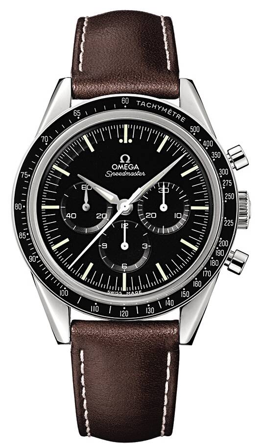 欧米茄超霸系列 “首枚欧米茄太空表” 纪念版 复刻了CK2998原型表款,精钢表壳,搭配黑色测速表圈,黑色表盘设有小秒针表盘、30分钟计时小表盘、12小时计时小表盘及中央计时指针,棕色皮表带凸显格调。 |