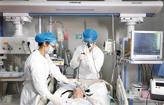 ■谭杰(右)正在为病患做插管。 |