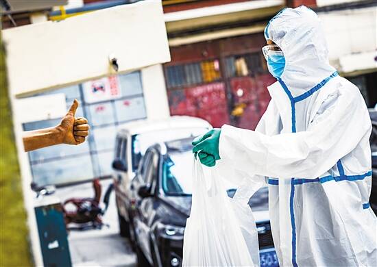 ■8月3日,在乌鲁木齐市天山区二道弯路25号院内,一名居家生活的住户向大学生志愿者竖起大拇指。新华社发 |