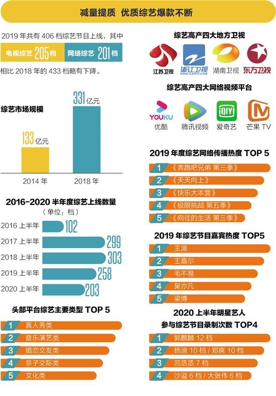 2020年开年,疫情的不可抗力给综艺市场带来巨大影响,线下录制停摆成为常态,大量综艺节目都将棚内录制搬到了线上,开启了综艺云录制、云综艺模式。云综艺拥有录制播出快、跟紧热点并迅速作出调整等优势,但同时衍生出的赛制不公平也受到质疑。 ■策划:新快报记者 罗韵 ■统筹:新快报记者 罗韵 ■采写:新快报记者 张磊 ■制图:廖木兴 节目类型多元化 综N代仍是市场“香饽饽” 互联网视频平台的崛起,一定程度上加速了国内综艺市场的发展。近几年我国综艺市场规模不断扩大,从2014年的133亿元大幅增至2018年的331亿元,其中2018年同比增长了21.3%。数量方面,2019年共有406档综艺节目上线,其中电视综艺205档,网络综艺201档,相比2018年的433档略有下降。 类型细分化和多元化是2019年综艺市场的重要趋势。真人秀和音乐类型综艺节目数量仍然占据优势,占比超过四分之一,成员大换血的《奔跑吧兄弟 第三季》和《极限挑战 第五季》两档国民综艺稳居2019年度真人秀综艺网络传播热度指数前两名。此外,养成类节目和生活观察类节目也悄然崛起,脱口秀节目更扎堆成为年末重头戏,《吐槽大会》《奇葩说》《脱口秀大会》等爆款持续释放出潜力。 综艺行业常以“综N代”来描述一档综艺节目的持续性播出效应,综N代具有影响力持久、节目周期长等特征。2019年头部综艺中,综N代的节目占据76%的份额,由此可见综N代节目具有更扎实的观众基础,更易获得综艺市场青睐。 在优酷、爱奇艺、腾讯视频、芒果TV四大网络平台公布的2019年综艺片单中,综N代节目题材主要集中在婚恋、亲子、语言、偶像养成等曾经的网综爆款方向,而湖南、浙江、江苏、东方、北京五大一线卫视平台综N代节目题材则深耕音乐、婚恋、演播室娱乐等领域,一般为平台历史弥久的王牌IP。单从综N代年度节目播放量来看,《奔跑吧兄弟 第三季》《王牌对王牌 第四季》《创造营2019》是2019年单年播放量最高的三款综艺,综合播放量分别达到60.5亿次、47.4亿次、42.8亿次。