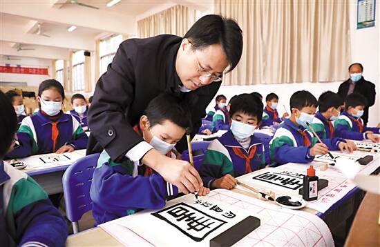 ■1月14日,南粤古驿道文创大赛驿道书社“圕圆舍”共建活动在韶关乐昌市坪石镇老坪石中心学校举行,书法老师向学生们教授毛笔字。 新快报记者 孙毅/摄
