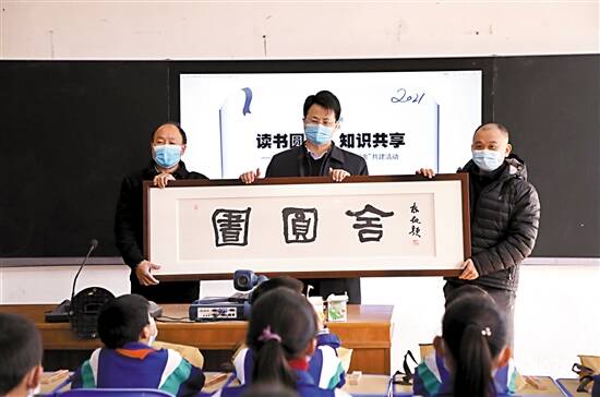 ■主办单位向老坪石中心学校赠送驿道书社牌匾。 |