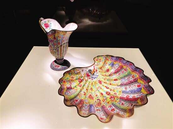 ■清乾隆铜胎画珐琅花卉纹洗盘及水浇。潘玮倩摄于粤博 |