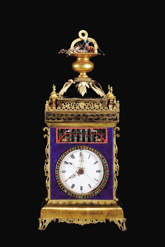 ■清铜胎鎏金透明珐琅花篮座钟。 粤博供图 |