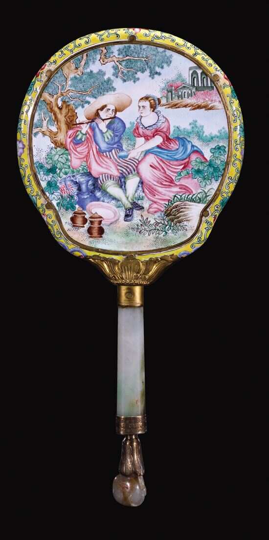 ■清中期铜胎镶翡翠柄画珐琅西洋人物把镜。粤博供图 |