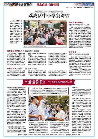做好防疫工作、开设复学第一课 “返校复课啦!”6月28日是广州市荔湾区各中小学复课返校的第一天。荔湾区各学校严格做好师生健康监测,进校前实行扫码、测温、手消毒,加强重点场所通风消毒,并严控