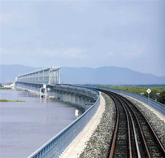 ■8月17日上午,中俄两国首座跨江铁路大桥——同江中俄黑龙江铁路大桥实现铺轨贯通。这是一条中国对俄铁路运输通道,也是一条西通欧洲的全新欧亚联运大通道。新华社发