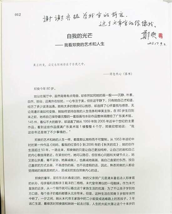 我第一次见到郑爽老师是在1993年秋天,那年我考入广州美术学院,学校给我们安排了名师讲座。第一场讲座是王肇民先生来讲,第二场主讲人就是郑爽老师。我看着讲台上的郑老师,她气质优雅,娓娓道来,讲述了她传奇般的出身和自己的版画创作,这一切深深吸引了刚进美院的我,这就是我想象中美院教授该有的样子吧。 1994年第八届全国美展广东省展在广东画院美术馆展出,我和同学相约去看,坐了好久汽车。在展厅中看到两幅郑老师作品,其中一幅叫《夏天的故事》,一棵伟岸的树上盛放着硕大荷花玉兰,树上挂着一个空空鸟笼,鸟儿不知飞去哪了,这是我第一次见到郑老师的版画原作,这幅水印木刻当时瞬间就击中了我,它让我深深感受到了版画的美,很震撼。 1995年左右,郑爽老师出版了她的第一本个人画册,这本画册比较完整地呈现了郑老师的整体创作面貌,也基本上决定了我在本科毕业以后选择木版画作为自己读研究生的专业方向,这显然与郑老师作品留给我的美好印象有很大关系。我太爱这本画册了,还多买了几本寄给朋友,现在它已绝版,而我家中依然有珍藏。 2000年我读研究生时,郑老师已退休,但还在担任广东省美协版画艺委会主任。我作为版画系研究生,常参与一些版画艺委会活动,也就从那时开始,有机会跟郑老师更近距离接触。又过了几年,我给《美术观察》杂志做“时代人物”栏目时,对郑老师的艺术人生做了访谈,发现无论是她的人生还是艺术,都是那么独特和不可复制,于是我们前前后后谈了二十几次。这批语音资料,我整理成18万多字的厚厚一本,郑老师又花了一两个月时间,从头到尾仔细看了,亲笔在打印稿上做了修正和校对,这份稿子十分珍贵。也因这次非常深入的访谈,我和郑老师的感情应该说比一般师生要亲近了很多,连她家最怕人的猫咪见了我都不躲不藏,甚至直接跳我身上蹭我。我甚至还和关小蕾师姐一起陪郑老师在岭南画派纪念馆前的荷花玉兰树下埋葬了她的爱猫黑黑。 后来我留校任教,看望郑老师更方便了,每次见面,聊天内容不仅限于版画专业创作,也包括艺术教学、人生不同时期遇到的困难和解决方式等等,我们谈感情,也谈生死,我们谈艺术,也谈名利,总之天南地北无所不谈,也常约着去吃饭,一起去看展览或到处走走,常见面的还有几位版画系师姐,像关小蕾、黄晓虹、詹晨、蔡忆龙,还有万小宁老师,我们还建了个常聊天的微信群。 2013年,我要办第一次个人展览,想请郑老师在开幕式致辞,郑老师爽快答应,认真准备发言稿,我看过她反复修改的草稿和细细誊写的正稿,很感动,扫描保存了起来。她如此这般为一个学生的展览准备致辞,这让我今天面对我的学生个展时也格外重视。在我的展览开幕时,郑老师做了很精彩的发言。此后出版画册,我就把老师的讲稿变成了我画册的序言《单纯的人 直接的画——齐喆和他的版画》。郑老师很少给别人写评论,这篇文章从我的人到作品,都有着郑老师独特的感受和认知,用属于郑老师的语言娓娓道来,平淡中透露着鼓励和期望,以及对我人品的肯定,我非常感动。《光明日报》发表我的作品时,也选用了这篇文章,不过题目被改成了《南北交辉印新彩》。 2016年,郑老师80岁,她希望把自己最完整保存的一套版画和水彩作品捐赠给广东美术馆,捐赠展览很成功,那么多人都来参加了,那天,郑老师笑得很开心,大家拍了很多很好看的照片。广东美术馆要给她出画册,郑老师希望我能为她这本画册写篇文章,我觉得义不容辞,还会有谁比我更熟悉郑老师的作品呢?我认认真真写了8000多字的一篇《自我的光芒——我看郑爽的艺术和人生》,当郑老师看到这篇文章后,她给我发了条微信,说看到这篇文章感动得流下了眼泪,因为她觉得这是非常理解她的人生和艺术的一个同行给她写的评论,她很感谢我。我觉得这是我写这么多文章以来最大的荣耀。2017年画册出版,这篇专论也发表了,郑老师让我去她家取书,她在画册扉页上写了几句诗:“大自然 我的上帝 今天我才知道 只有我一个人的时候 你才肯接见我 ——送给齐喆留念 郑爽2017.9.2。”又在我的文章前面写道:“谢谢齐喆为我写的前言,这个文章写的很像我。郑爽2017.9.2。”这本画册我会珍藏,因为,它纪念着我们师生间的理解和感情。 近十几年来,我可能是跟郑爽老师接触和交流最多的学生,我认为自己非常理解这位老师和女艺术家,虽然她外表非常谦和,但事实上有一颗非常强大的内心。她在人生的重大节点和对待自我的艺术和自我的选择上,有着男性都不具备的清醒判断和感知力以及决断力。我常说郑爽老师外表像一个圆形,很温和,但她内心里有一个正方形,棱角分明,任何人也不能越过边界,否则就会碰得头破血流,这就是我心目中的郑爽老师。 今年8月12日是郑爽老师85岁生日,因为去年郑老师在上海,我们已有近大半年时间没有见到她。在她生日前夕,我和潘老师还有几位师姐聚在一起打电话给老师,一一向她问候,祝她生日快乐,她清晰记得我们每一个人,很开心,说想念广州,要回来取她的东西。郑老师一切都好,这是近期让我最开心的一件事。 今天是广州美院开学的第一天(编者注,2021年9月2日),9月到了,也意味着马上要到教师节了,我很想念我的老师,也是我艺术上的同行——郑爽老师。非常幸运能有缘分和这样一位中国当代伟大的艺术家有过十多年非