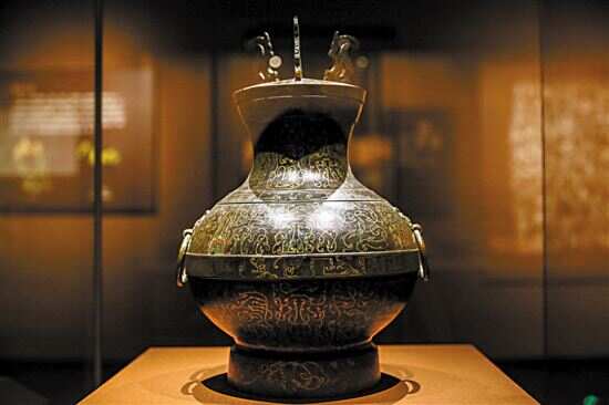 ■错金银鸟篆文铜壶,西汉,1968年满城中山靖王刘胜墓出土,河北博物院藏。鸟篆文是战国时期楚国的文字,以鸟虫之形组字,似书似画。西汉文化沿袭楚文化之后,鸟篆文成为常见的装饰艺术字体。壶上的鸟篆文是一篇颂酒的诗文,阐明了饮酒的益处,是我国以酒为药、养生祛病保健法的较早记录。 |