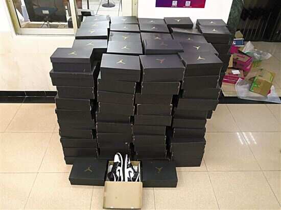 ■警方查获的大量涉案球鞋。通讯员供图 |