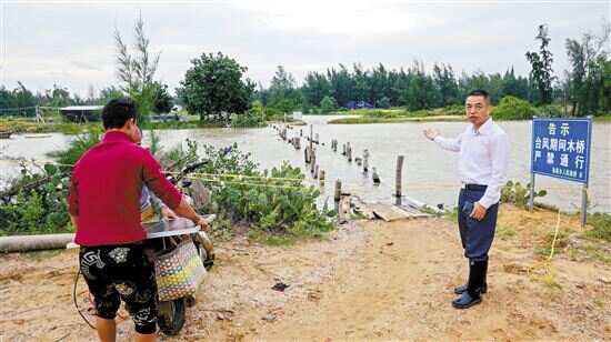■避风塘处的小木桥已被海水淹没,木桩还在水面“露头”,“严禁通行”的警示牌醒目立于桥两端。 |