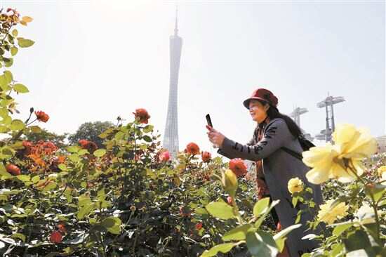 广州近日天气晴好,气温回升。花城广场上的玫瑰花竞相盛开,吸引了不少市民游客前来观赏。