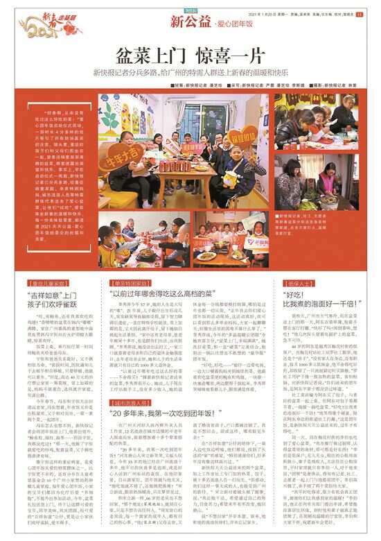 十年相伴 温暖如昔 2022年虎年新春将近,新快报“爱心团年饭”公益活动亦迎新岁而至。2022年1月16日,“天天公益·爱心团年饭”将在羊城创意产业园举行“十年相伴,温暖团圆”启动出发仪式,以“云团圆”方式,向身处广州的困境家庭,送出温暖陪伴。 ■新快报记者 李斯璐 严蓉 潘芝珍 携手爱心企业爱心机构,已着手筹备 2013年春节前夕,新快报天天公益首次举办“爱心团年饭”,为身处广州的困境家庭送出一餐有肉有菜有表演有热闹的团圆饭,让他们感受到来自“大家”的温暖与关怀。 2021年春节前夕,新冠肺炎疫情未平,“爱心团年饭”仍不爽约,从线下搬到“云端”,为困难群体送出美味盆菜。 2022年春节将至,这顿爱心家宴延续温暖,如约而至。在共青团广东省委员会、羊城晚报报业集团、广州市妇联、广州市慈善会指导下,主办方广东新快报社、广东公益恤孤助学促进会携手爱心企业、爱心机构,已着手筹备前期工作。 将配送到近200个特需家庭 特别鸣谢本次活动联合主办单位中国银行广东省分行、香江控股、广东太古可口可乐有限公司等。在各爱心企业共同配合下,新快报将凝聚着社会各界无限关怀,形成新春礼包,并配送到近200个特需家庭。 有盆菜有祝福,活动将同步直播 据了解,每一份饱含真情的礼盒内,都有象征团圆的美味盆菜,还有慰问信、饮品,以及广东书法名家手书的“福”字。 当下,社会处于严防疫情的特殊时期,为了保障大家的安全,同时也让更多的困境家庭“出席”爱心团年饭,活动将同步直播,欢迎读者参与其中,共同见证别样团年,品味情义广州。