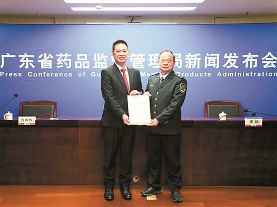 ■广东省药品监管局党组成员苏盛锋现场为三家港澳企业颁发首批港澳传统外用中成药内地上市注册证书。 |