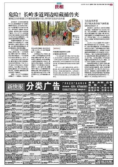 黄埔区长岭街道已开展排查清除行动,呼吁驴友徒步走步道 新快报讯 记者林钢威报道 行人走山路被捕兽夹“咬”住脚的事情时有发生,近日有网友反映,在广州市黄埔区牛木北线(徒步路线)一带布有多个捕