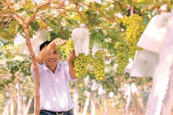 ■阳光玫瑰葡萄试种成功,金田园种植社成了真正的“金田园”。图为园主徐庚生采摘葡萄。 |