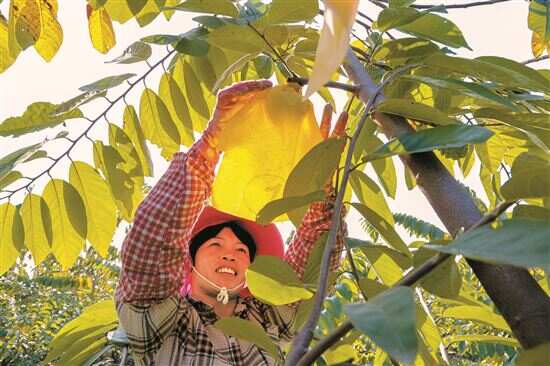 ■南盛街道平垌村的藏龙湾释迦果基地里,村民正在给果子套袋。 |