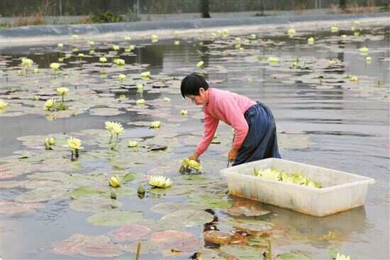 ■工人在水田里采摘香水莲花“黄金国”。 |