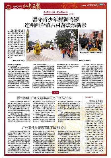 新快报讯 记者林钢威 通讯员粤公宣报道 记者从广东省公安厅获悉,春节假期,全省公安机关接报治安警情、刑事警情同比去年春节分别下降34.09%和29.18%;道路交通事故同比下降52.6%;省内2