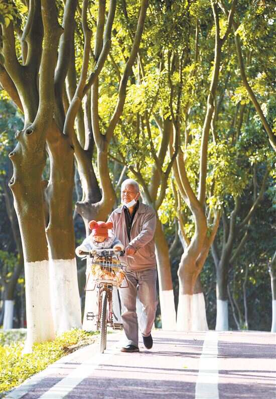 ■昨日,阳光回归,爷孙俩在大夫山森林公园散步。未来几天,广州市区白天气温逐步上升,但早晚温度仍是个位数。新快报记者 郭思杰/摄