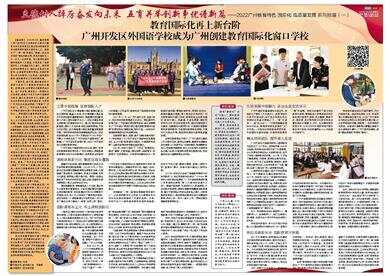 【编者按】 2020年6月,教育部等八部门发布《关于加快和扩大新时代教育对外开放的意见》,提出要加快培养具有全球视野的高层次国际化人才。国家关于“一带一路”的倡议,“构建人类命运共同体”理念的提出等,更是对国际化人才一次又一次的呼唤。作为重要的国际教育枢纽和人才枢纽,中国具备了培养国际化人才的基础与巨大潜力。然而受近两年疫情常态化、国际关系复杂化的影响,出国留学热暂时降温;双减和职普比变化的影响,又让更多人选择国际教育,国际教育本土化迎来新机遇。 可喜的是,在中国,越来越多的中国孩子在家门口就能接受国际化教育。疫情当前,这种需求与趋势更加凸显。在广州东部,就有这么一所国际化知名学校,强调以中华文化和中国精神为根本,融汇各国优秀文化,培养人类命运共同体的追求者和建设者,它便是广州开发区外国语学校(下简称“广开外语”)。前不久,广开外语成为首批广州市教育国际化窗口学校培育创建单位之一,学校国际化教育再迈新台阶。 全球大变局之下,什么样的国际化人才才是国家所需、社会所需、时代所需?快速变化的世界,如何定义国际化人才的培养?这些关乎教育、关乎每位学子的教育选择,也关乎人们应对未来的人生挑战与自我探索,成为当下最需要破解,也是教育如何面向未来、适应未来的新命题。以教育国际化窗口学校培育创建单位为发展契机,且看广开外语关于国际化教育做出怎样的思考、探索与展望。 2021年6月,广州市启动首批教育国际化窗口学校申报工作,依据《广州市教育国际化窗口学校创建指标体系》对申报学校进行严格考察和在线答辩。最终,广州开发区外国语学校(简称“广开外语”)荣耀上榜,成为首批入选的20所教育国际化窗口学校培育创建单位之一。为期2年的创建期满后,将接受专家组的评估验收,经市教育局审核确认达到优秀等级后将被认定为教育国际化窗口学校。 教育国际化窗口学校建设是广州市贯彻落实《教育部等八部门关于加快和扩大新时代教育对外开放的意见》,规范和引领全市中小学校加快推进教育对外开放工作,进一步提升学校教育国际化发展水平和质量,培养德智体美劳全面发展且具有国际视野的新时代青少年的一项重要举措,也是《广州市教育事业发展“十四五”规划》和《广州市教育对外开放“十四五”规划》重点工程之一。在“十四五”期间,广州遴选校园环境建设和文化建设国际化元素突出、师生国际交流与合作经验丰富、教育教学基础好及质量高的中小学校,培育和创建成为教育国际化窗口学校。每年确定15至20所普通中小学(含公、民办)为教育国际化窗口学校建设单位。 成为首批教育国际化窗口学校培育创建单位,既是教育行政部门与社会各界对广开外语坚持国际化办学的高度认可,也是广开外语基础教育国际化成果的全面展示,更是学校丰富教育国际化内涵,提升学校办学品质的新契机和新要求。 统筹策划:刘浩 专题采写:新快报记者 邓善雯 专题图片:受访者供图 立足中国根基 培育国际人才 广州开发区位于粤港澳大湾区重要位置,区位优势明显,奠基40年来,作为粤港澳大湾区高水平科技创新的重要载体和广深港澳科技创新走廊十大核心国际创新平台之一,定位为建设具有全球影响力的国家知识中心,着力打造知识创造新高地、国际人才自由港、湾区创新策源地、开放合作示范区,成为粤港澳大湾区高质量发展重要引擎。学校和学校的领导者敏锐地抓住这一良好的发展机遇,在2017年4月将创办于1958年的广州第87中学改名为“广州开发区外国语学校”,积极融入广州开发区的发展大势,兴办广州开发区自己的国际教育学校。 广州开发区外国语学校兴办以来,践行“负责任的教育培育负责任的人”的办学理念,积极探索教育国际交流与合作新模式,培养具有全球竞争力的高端人才后备军,逐渐形成了独具特色的国际化教育氛围。 2018 年12 月,以广开外语为主导,包括8所公、民办学校的教育集团正式成立。顺应新时代改革开放、广州东部区域发展和学生、家长发展需求,广开外语以“转型升级打造优质教育国际化品牌”的责任担当,脚踏实地,笃行不怠,一举成为外国语教育集团化办学品牌学校。 在教育局“融合、拓展、提升”战略决策的指引下,学校制定了《广州开发区外国语学校发展规划》,全力打造“教育国际化路径,外国语教学品牌”,全新的发展目标和路径就此确立。 2021年,学校又制定了“十四五”发展规划,确定“遵循‘中国根基,国际视野,丝路情怀,民族责任’的发展理念,力争将学校建设成为一所校园环境优雅、管理机制科学、师资队伍优化、教育质量稳步提高,育人特色初步形成的广州市教育国际化窗口学校,培育具有社会责任感的、既有中国心、民族魂,又有世界眼、国际范的现代公民”的总体发展方向,通过加强校园文化建设、创建国际化教师队伍、打造国际理解教育和多语种教学、开发国际教育特色课程、开展对外交流合作等,推动学校国际化教育高质量发展。 在责任教育理念引领下,广开外语把立德树人作为根本任务,倡导生态德育,遵循学生道德生成的规律,以“校园节会”为有效载体,强调德育生活化,把培育民族精神、树立文化自信作为培养学生正确人生观、价值观和世界观的重要内容,形成富有生命力道