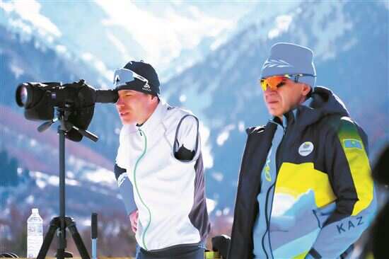 ■2月21日,哈萨克斯坦冬残奥运动员亚历山大·戈利兹(左)与教练在训练中。新华社发 |