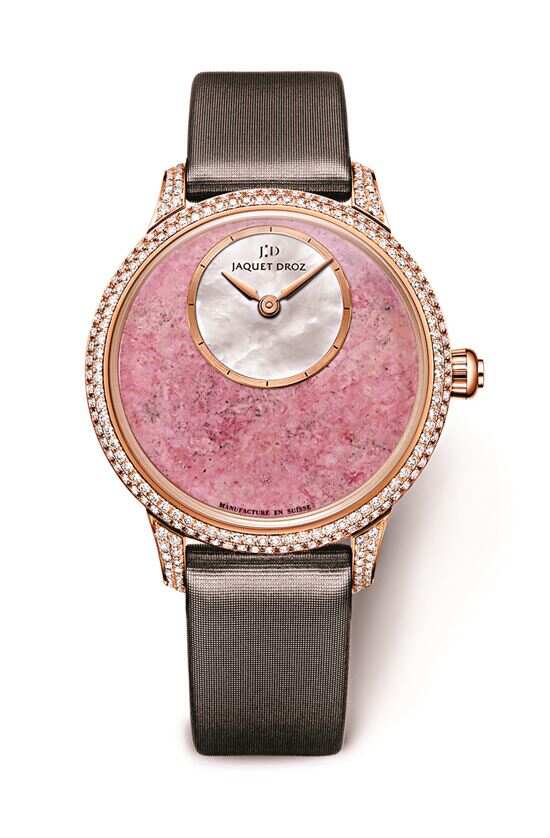 雅克德罗蔷薇辉石时分小针盘 雅克德罗将蔷薇辉石精心抛光打磨,令其在腕间绽放瑰丽光芒与别致纹理,并与表圈上璀璨的钻石交相辉映,将温暖、平和的能量与柔美风情倾现于腕间。