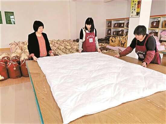 ■黄敏容(左)说,每一床蚕丝被做好,都要经过严密的检查。 |