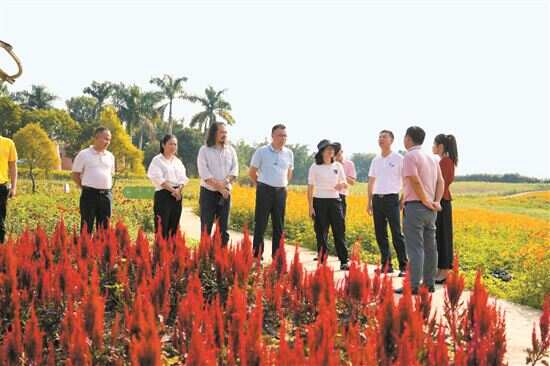 ■叶茵茵(左五)和广东、澳门等地客商代表到忻城薰衣草庄园考察调研。 |