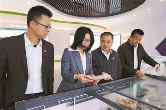 ■叶茵茵(左二)在粤桂协作产业园忻城县南方牛都练江养殖基地了解肥牛深加工产品情况。 |