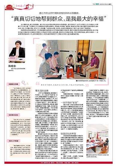 湛江市农业农村局扶贫规划科科长陈碧泉: 陈碧泉 湛江市农业农村局扶贫规划科科长 “要有学习精神,武装好自己的头脑,才能应对各种挑战。” 白天调研走访,晚上伏案笔耕。湛江市