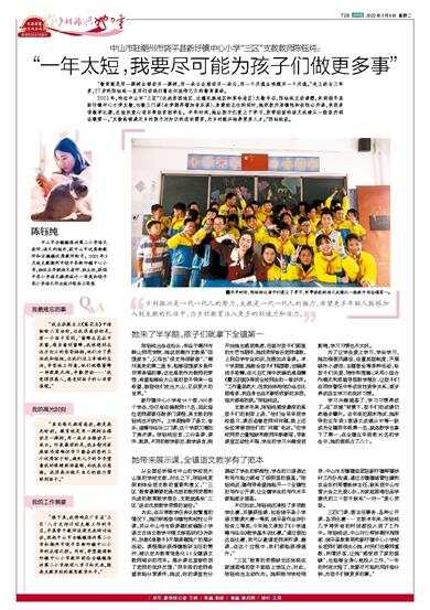 中山市驻潮州市饶平县新圩镇中心小学“三区”支教教师陈钰纯: 陈钰纯 中山市古镇镇海洲第二小学语文老师、语文科组长,获中山市优秀新教师和古镇镇优秀教师称号。2021年9月起支教潮州市饶