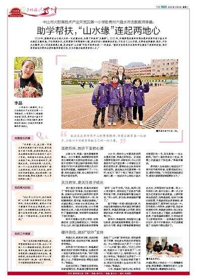 中山市火炬高技术产业开发区第一小学赴贵州六盘水市支教教师李晶: 李晶 小学语文一级教师,中山火炬高技术产业开发区第一小学级组长、心育团队(心理健康活动室)成员;贵州省六盘水市水城区第