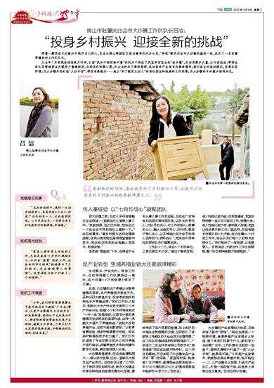 佛山市驻肇庆四会市大沙镇工作队队长吕洁: 吕 洁 佛山驻肇庆四会市大沙镇工作队队长 “感谢组织的信任,委派我参加了乡村振兴工作,让我可以为国家的乡村振兴战略奉献绵薄之力。”