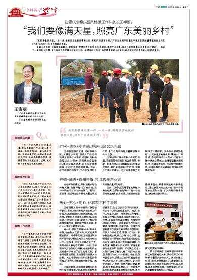 驻肇庆市德庆县凤村镇工作队队长王海丽: 王海丽 广东省水利厅驻肇庆市德庆县凤村镇帮镇扶村工作队队长 广东省水利水电科学研究院副院长 “我们要像满天星一样,一点一滴、踏踏实