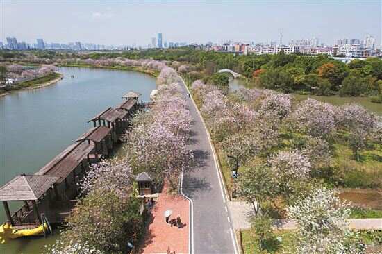 进入3月以来,随着气温的升高,广州海珠湿地一期的宫粉紫荆也进入了花期,连片的宫粉紫荆花烂漫盛开,形成了一条粉紫色的花带,吸引了不少市民前来打卡游玩。 新快报记者 毕志毅摄影报道
