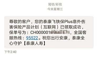■陈发(化名)收到的泰康人寿“飞铁保”领取成功的通知。 |