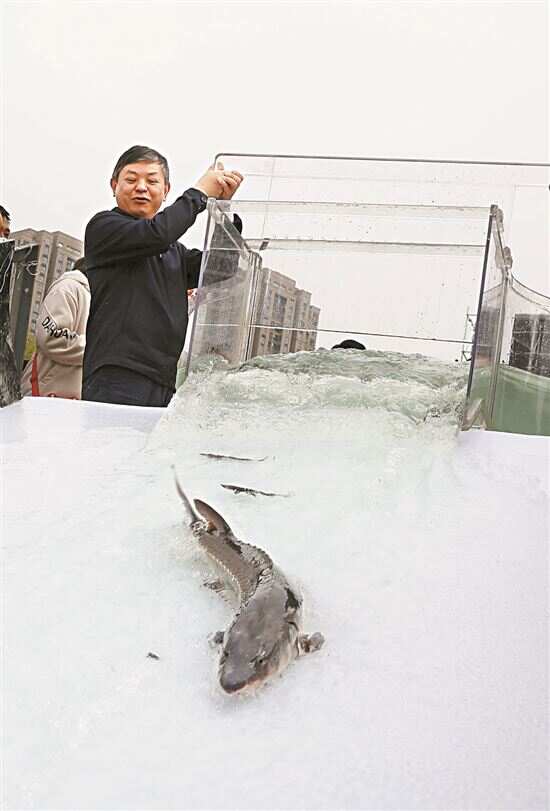 ■3月26日,人们在湖北宜昌向长江中放流中华鲟。 新华社发 |