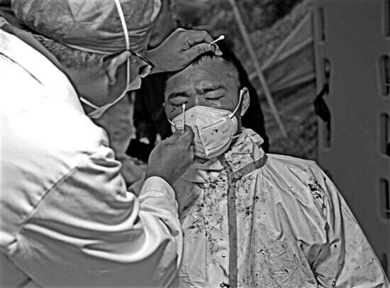 医治搜救人员 3月26日,一名搜救人员被泥沙溅到眼睛,医护人员在为他医治。 |