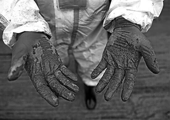脱下防护服后 3月26日,一名搜救人员脱下防护服后头发已经湿透。当日,在东航MU5735客机坠毁事故核心现场,搜救人员展开拉网式搜索。 |