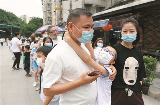 ■23日上午,在广州市荔湾区流花路小学西校区,不少家长和学生以家庭为单位有序排队进行核酸检测,为返校复课做好准备。新快报记者 孙毅/摄