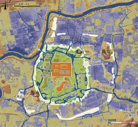 ■良渚古城三重结构、重要台地和水系分布。 |