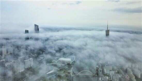 ■昨日,广州市中心上空云雾缭绕,降雨强度并不大,但在从化鳌头镇,当天8时-17时,录得258.7毫米的特大暴雨。预计12-13日暴雨持续,市民需继续做好防御。 新快报记者 夏世焱/摄