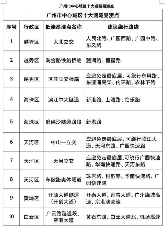 城乡积涝和地质灾害风险高,市民仍将做好防御措施 昨日白天,广州北部和清远南部出现了暴雨到大暴雨,局地特大暴雨;茂名、肇庆北部、韶关南部、阳江南部、江门南部、珠海和中山市县出现了大雨到暴雨局部大暴雨。11日,广州市应急管理局发布气象信息快报,广州已出现了暴雨到大暴雨,11日夜间起至13日将进入此轮暴雨降水过程的高峰期,城乡积涝和地质灾害风险高,需继续做好相关防御工作。 预计,12日-13日广东省将有大范围的暴雨到大暴雨局地特大暴雨降水;受冷空气影响,13日-14日全省气温下降。 ■采写:新快报记者 许力夫 黎秋玲 通讯员 伍志方 交通宣 广东天气预报 12日,珠江三角洲、粤东市县有暴雨到大暴雨,局地特大暴雨;河源、梅州和粤西市县有暴雨局地大暴雨;其余市县有大雨,局部暴雨。最低气温分布:粤北的北部和粤东市县21℃~23℃,其余市县23℃~26℃。 13日,梅州、河源、粤东和珠江三角洲中南部市县有暴雨,局部大暴雨;其余市县中雨到大雨局部暴雨。受冷空气影响,全省气温下降。最低气温:北部市县15℃~17℃,其余市县18℃~21℃。 14日,广东省中北部市县雨势明显减弱,南部市县仍有大雨局部暴雨。最低气温:中北部市县14℃~16℃,其余市县17℃~21℃。 广州市区天气预报 12日,阴天,有暴雨到大暴雨,局部特大暴雨,气温介于22~25℃之间,相对湿度介于85~98%之间,吹和缓的偏南风。 13日,阴天,有暴雨,局部大暴雨,气温介于23~26℃之间,相对湿度介于85~98%之间,吹和缓的西南风。 14日,大雨,气温介于23到27℃之间,吹轻微的东北风。 答疑 昨天广州暴雨为何“失约”? 前天夜间的强降水主要出现在广东沿海的阳江、台山、珠海、深圳等市,上述地区相继发布了暴雨红色或橙色预警信号,其中阳江出现了12小时336毫米的特大暴雨。 但正是由于广东沿海地区暴雨云团的强烈发展,像一道屏风一样截留了来自孟加拉湾和南海的大量暖湿水汽,造成5月10日夜间至11日上午广州没有出现预期中的暴雨。随着南部沿海地区暴雨云团的东移减弱,其水汽截留作用将明显减弱,广州后期降水将重新加强。 气象部门表示,这次的暴雨过程是基于季风爆发而预报的,整个广东都处于非常有利于降水的形势。而10日晚至11日,广州的南边、北边和西边都雨势较大,像从化区鳌头镇、良口镇启动了暴雨红色预警。但广州中心却“躲过”了,这正是暴雨预报的传统难题——落区。 从现在气象要素资料分析,预计雨势之后会趋于明显,由于暴雨强度大、致灾性强,各方还需提高警惕,万万不可麻痹大意,切实加强防范准备,确保安全。 提醒 驾车请避开城区十大道路涵隧易涝点 持续性暴雨到大暴雨天气,减少出行的情况下,如果还在路上,应该怎么做?为做好2022年汛期道路涵隧防汛防内涝工作,市交通运输局会同市水务局对全市862个涵洞及下凹式立交进行全面排查。结合历史水浸情况及地理位置,梳理出131个低洼易涝点,其中大北立交、淘金路铁路桥底、区庄立交桥底、滨江中大隧道、磨碟沙隧道路段、中山一立交、天河立交、车陂路奥体隧道、开源大道隧道(开创大道)、广云路隧道段等10处为重点防汛防内涝点位(见右图)。 车主和行人需要关注重点路段水浸情况,通过涵洞时观察水积线情况和现场指引。尽量避开重点涵洞易涝点,提前绕行。降雨期间路面湿滑、能见度较低,注意行车安全,降低车速保持车距。 暴雨天这样停车更安全 1.请车主密切关注气象预报,不要停在低洼易浸区域、路段,不要停在大树、危墙、电话岗亭等位置旁边; 2.车辆停放地下车库的,可在挡风玻璃显眼位置预留联系电话,以便停车场工作人员可及时联系到你;接到车辆疏散通知时,服从现场指挥,安全有序驾车撤离现场; 3.发生“水浸车”时,切勿贸然启动车辆,可先将车辆移至安全地带,再送汽车修理厂维修;车主可以结合实际情况购买“水浸车”商业险,减少经济损失。