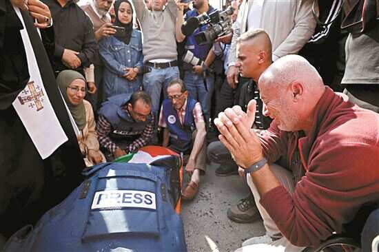 5月11日,在约旦河西岸杰宁,人们在女记者的葬礼上围着她的遗体哀悼。 巴勒斯坦卫生部11日发表声明说,卡塔尔半岛电视台一名女记者当天在报道以色列军队和巴勒斯坦人在约旦河西岸杰宁难民营的冲突时不幸中弹身亡。声明说,死者名叫希琳·阿布·阿克利赫,巴勒斯坦人,是卡塔尔半岛电视台阿拉伯语频道的记者。她头部中弹,送往医院后不治身亡。新华社发