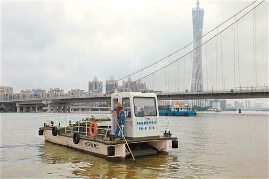 由于连降暴雨,很多垃圾随着洪水冲入珠江,广州连日出动保洁人员400多人、各类保洁船只176艘,对珠江开展水上垃圾打捞。新快报记者 毕志毅/摄 03